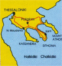 Die Halbinsel CHALKIDIKI , auch Chalkedike oder Halkidiki genannt, liegt südostlich von Thessaloniki. Ihre Naturschönheiten mit malerischen Häfen und ruhigen Fischerdörfern umgeben von Bergen mit einzigartiger Vegetation trifft man auf SITHONIA an, der mittleren Halbinsel von ChalkIdiki. |